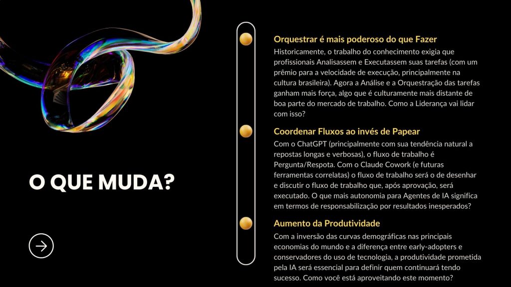 👉 Do ponto de vista dos profissionais, a transformação é ainda mais direta: quem aprende a trabalhar com IA amplia seu valor; quem ignora, corre o risco de ficar para trás. Não se trata de substituir pessoas, mas de aumentar capacidades humanas.